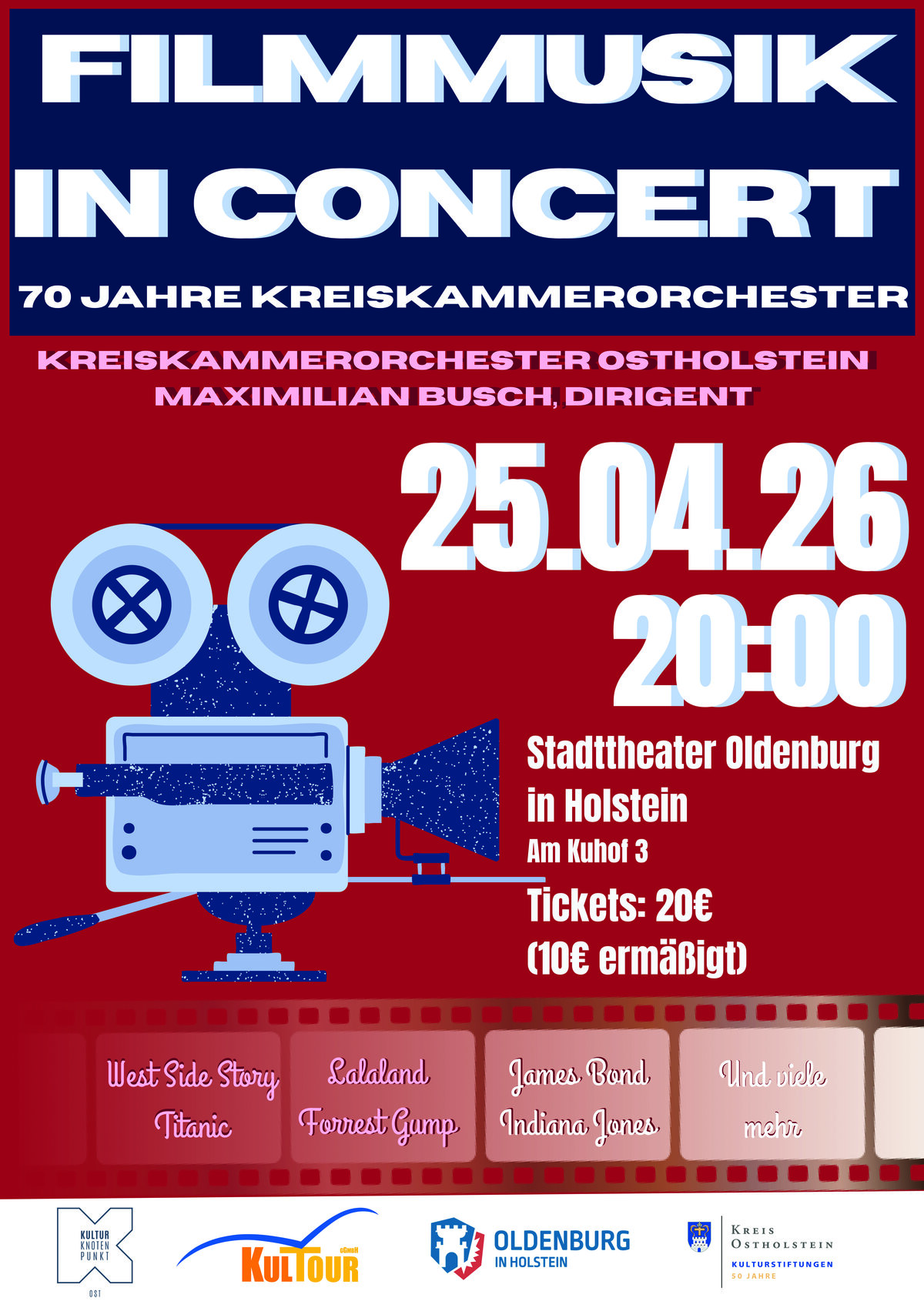 Das Kreiskammerorchester Ostholstein feiert in diesem Jahr sein 70-jähriges Bestehen mit einem besonderen musikalischen Höhepunkt: Unter dem Titel „Filmmusik in Concert“ laden das Ensemble am Samstag, den 25. April 2026, um 20:00 Uhr ins Stadttheater Oldenburg in Holstein, Am Kuhof 3, ein.